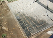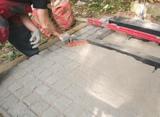 Засыпаем брусчатку пескобетоном, снимаем лишний слой, замываем.